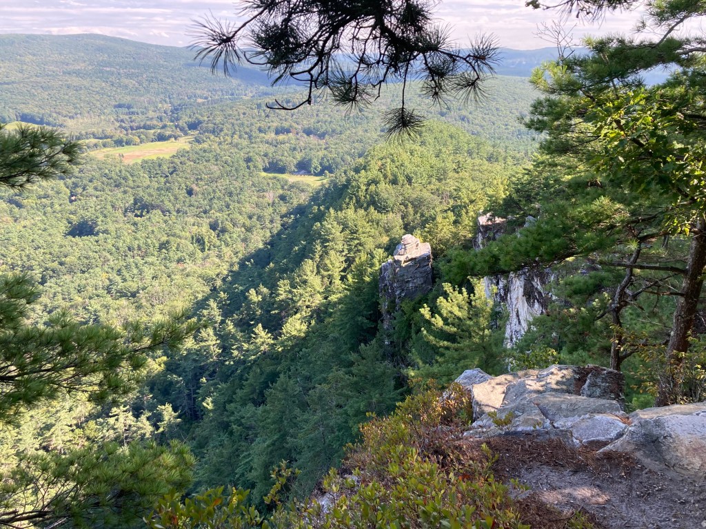 The Peeskawso Peak Trail (red blazes, 0.6 mi) connects the upper ends of both trails, traversing the narrow, rocky ridgeline to the summit. This stretch offers the best views—north to Mount Greylock, west to the Catskills—and includes a short spur to Devil’s Pulpit, a dramatic free-standing rock pillar below the cliffs. Don’t miss it—it’s just off the Peeskawso Peak Trail and well worth the brief detour. The ridgeline requires some scrambling but remains non-technical.