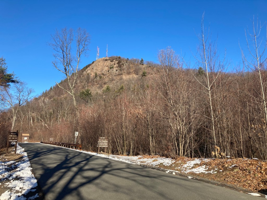South and East side to Railway Path: A fairly quick and easy route to the summit begins at a parking area on Route 141. Trailheads on the east side of 141 will take you to multiple trails. One is the New England Trail, which cuts right up the steep southern face of the mountain, offering a vigorous and fast route to the top. A more gradual route follows an unnamed path around the east side of the mountain, eventually meeting up with the old Funicular Railway path (now a paved access road). This will bring you to the summit. It also passes the B-17 memorial which is along the Railway route. Double-back for a fairly easy, family-friendly route of 2.8 miles and 686 feet of elevation gain.